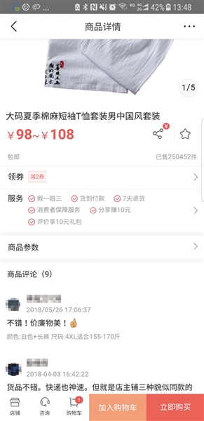 昨日,记者在放心购3.0中搜索“男装T恤/polo”,销量排名第一的商品显示有250450人付款,却仅有9条评价,排名第二的有96803人付款,评价数为0。