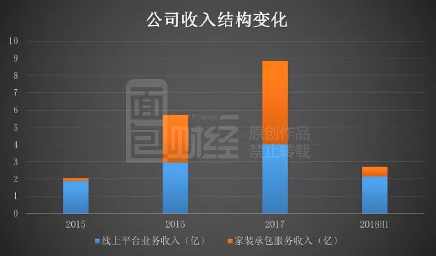 从财务数据来看,公司线上平台业务的营收从2015年的1.9亿上升到了2017年的4.02亿,两年上涨了2.12倍。家装承包业务在2018年伴随着公司的主动收缩而大幅减少。