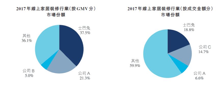 由于互联网本身的特性,线上的集中度明显高于线下。按照GMV(网站总成交额)与成交金额测算,土巴兔都位居第一。但是,以成交金额测算,行业第二名的市场份额已经与公司比较接近。
