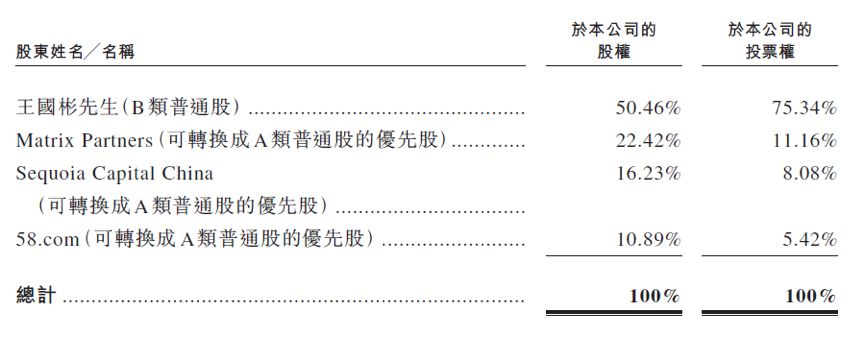 公司采取双重股权结构,创始人拥有更高的投票权。创始人王国彬持有50.46%,但拥有75.34%的投票权。其他股东包括经纬创投、红杉中国以及58同城。